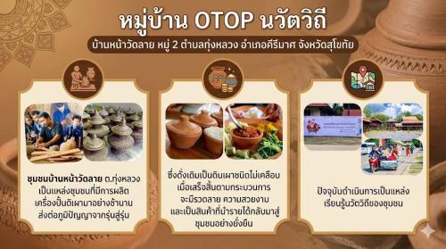 🌈 สำนักงานพัฒนาชุมชนอำเภอคีรีมาศ ขอเชิญชวนทุกท่าน ... พบกับ ...หมู่บ้าน OTOP นวัตวิถี "แหล่งชุมชนเครื่องปั้นดินเผาบ้านหน้าวัดลาย ตำบลทุ่งหลวง " จากหลักฐานดั้งเดิม ผลิตภัณฑ์เครื่องปั้นดินเผา ถูกใช้ในชีวิตประจำวันของชาวตำบลทุ่งหลวง อำเภอคีรีมาศ จังหวัดสุโขทัย มาอย่างช้านาน ทั้งในรูปแบบของเครื่องใช้สอย และของประดับตกแต่ง ซึ่งสะท้อนถึงภูมิปัญญา การใช้สิ่งของที่มีในชุมชน ประกอบด้วยดิน และแหล่งน้ำที่อุดมสมบูรณ์ จนมีคำกล่าวที่ว่า "ดินในตำบลทุ่งหลวง ใช้ 10 ปี ก็ไม่มีวันหมด" เนื่องจากได้รับความร่วมมือในการอนุรักษ์ และฟื้นฟูทรัพยากรธรรมชาติ อย่างต่อเนื่อง และส่งเสริมให้เยาวชนเห็นถึงคุณค่า ของดิน โดยแหล่งท่องเที่ยวสำคัญในชุมชน ประกอบด้วย